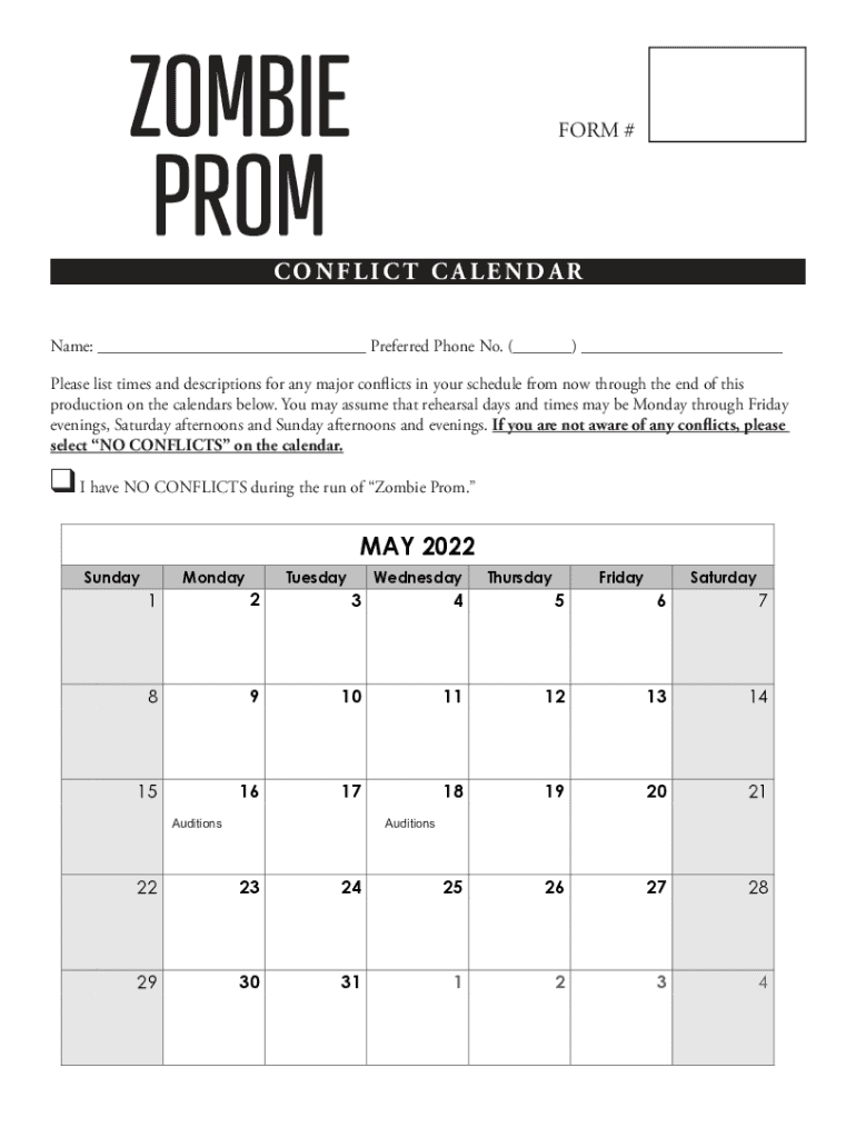 FORM #CONFLICT CALENDAR Name: ___ Preferred Phone No. (___) ___ Please list times and descriptions for any major conflicts in your schedule from now through the end of this production on the calendars
