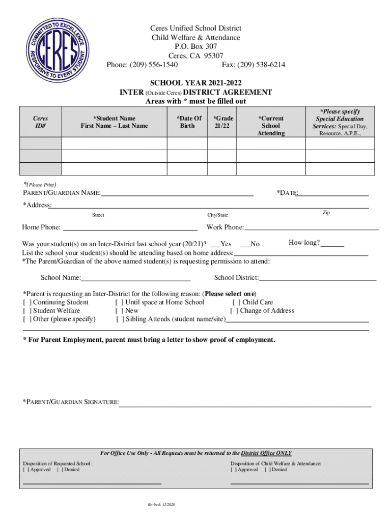 Ceres Unified School District Child Welfare & Attendance P.O. Box 307 Ceres, CA 95307 Phone: (209) 5561540 Fax: (209) 5386214 SCHOOL YEAR 20212022 INTER (Outside Ceres) DISTRICT AGREEMENT Areas with