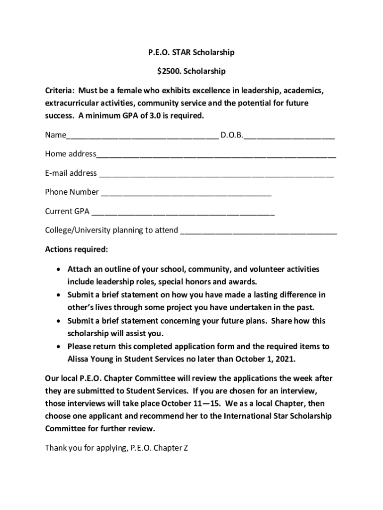 P.E.O. STAR Scholarship $2500. Scholarship Criteria: Must be a female who exhibits excellence in leadership, academics, extracurricular activities, community service and the potential for future success.