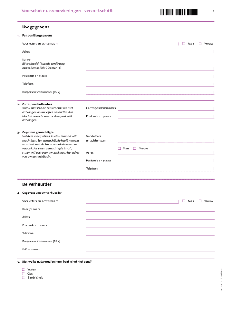 Servicekosten en nutsvoorzieningen moeten worden ingevuld op een specifiek formulier dat wordt verstrekt door de verhuurder of de belastingdienst.