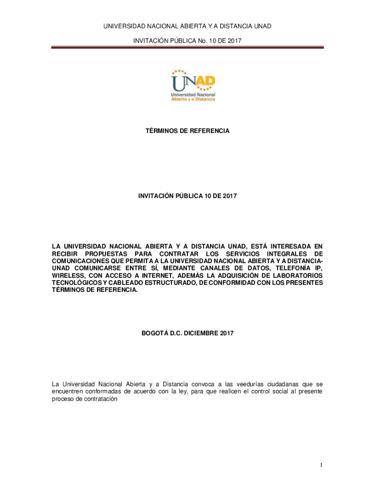 INVITATION PBL ICA No. 10 DE 2017TRMINOS DE REFERENCIAINVITACIN PBL ICA 10 DE 2017LA UNIVERSITY NATIONAL ALBERTA Y A DISTANCE NAD, EST INTEREST EN