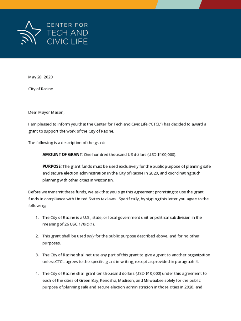 I am pleased to inform you that the Center for Tech and Civic Life (CTC) has decided to award a