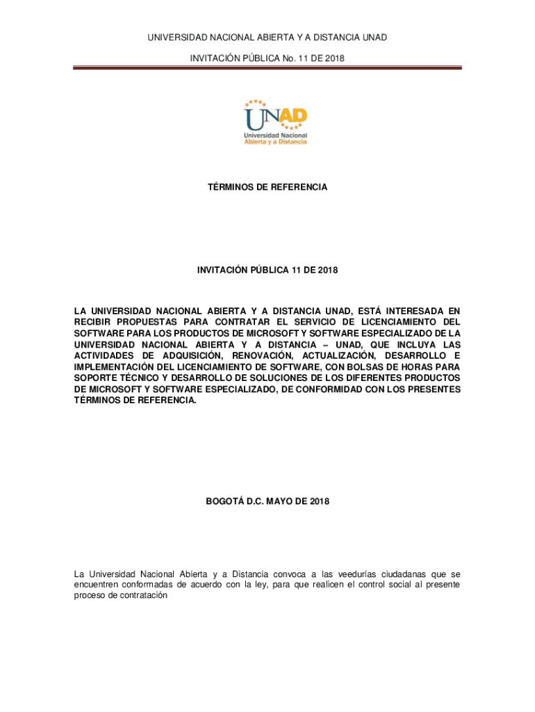 INVITATION PBL ICA No. 11 DE 2018TRMINOS DE REFERENCIAINVITACIN PBL ICA 11 DE 2018LA UNIVERSITY NATIONAL ALBERTA Y A DISTANCE NAD, EST INTEREST EN