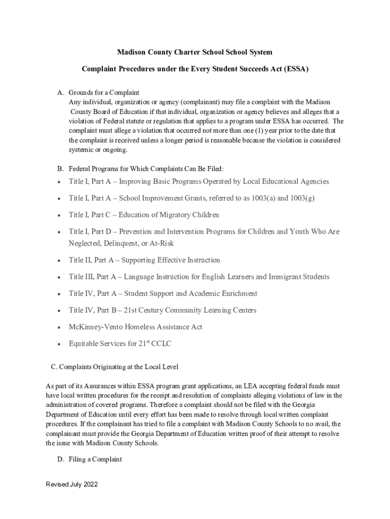 Madison County Charter School System Complaint Procedures under the Every Student Succeeds Act (ESSAY) A. Grounds for a Complaint Any individual, organization or agency (complainant) may file a complaint