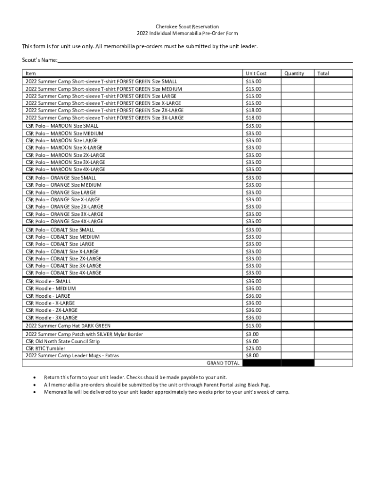 Cherokee Scout Reservation 2022 Individual Memorabilia PreOrder Form This form is for unit use only. All memorabilia preorders must be submitted via Black Pug. Available Items 2022 Summer Camp Shirt