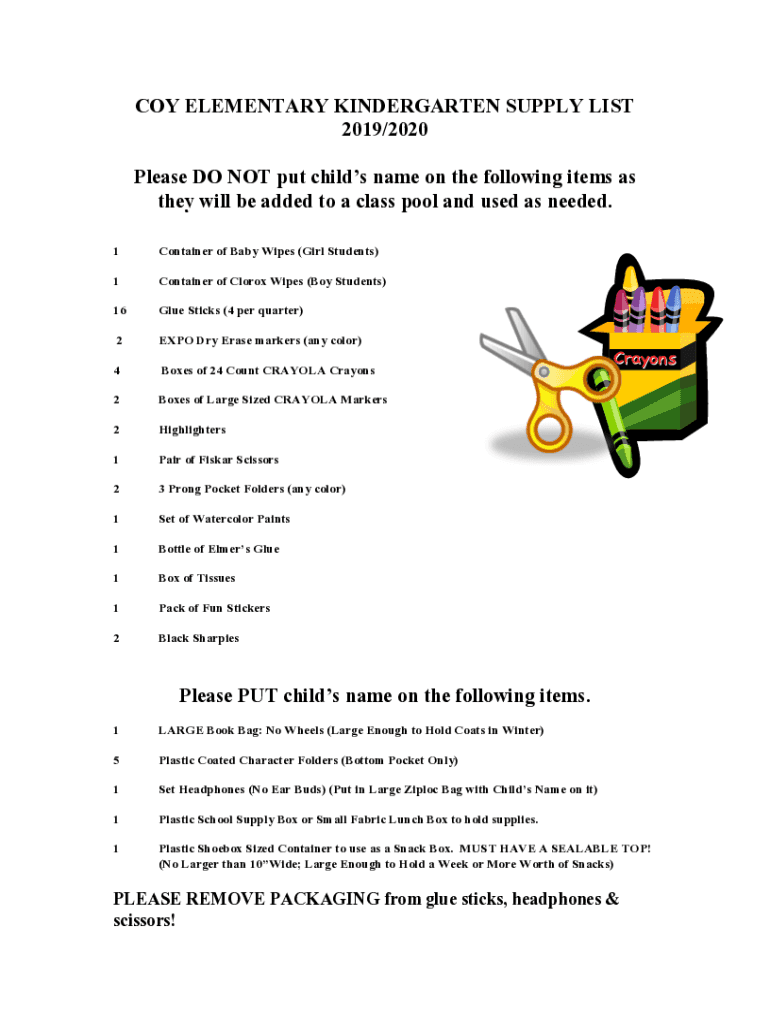 COY ELEMENTARY KINDERGARTEN SUPPLY LIST 2019/2020 Please DO NOT put children name on the following items as they will be added to a class pool and used as needed. 1Container of Baby Wipes (Girl Students)1Container