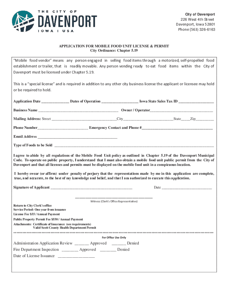 City of Davenport 226 West 4th Street Davenport, Iowa 52801 Phone (563) 3266163APPLICATION FOR MOBILE FOOD UNIT LICENSE & PERMIT City Ordinance: Chapter 5.19Mobile food vendor means any person engaged