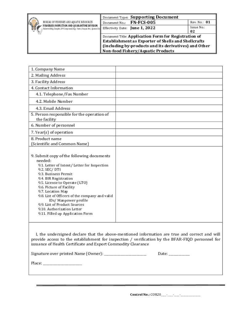 Document No.:Supporting Document FNFCS005Rev. No.: 01Effectivity Date:June 1, 2022Issue No.:Document Type: BUREAU OF FISHERIES AND AQUATIC RESOURCES FISHERIES INSPECTION AND QUARANTINE DIVISIONFisheries