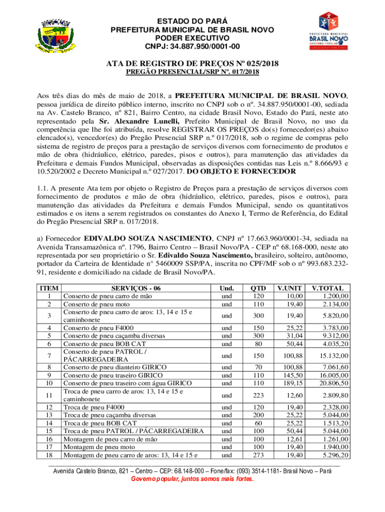 ESTATE DO PAR PREFECTURE MUNICIPAL DE BRAZIL NOVA POWER EXECUTIVE CNJ: 34.887.950/000100ATA DE REGISTRY DE PRESS N 025/2018 PRESO PRESENCE/SRP N. 017/2018Aos TRS Dias do ms de main DE 2018, a PREFECTURE