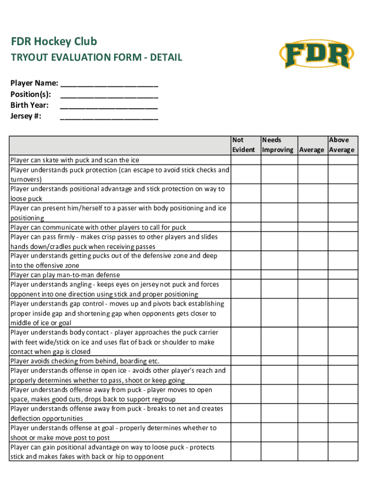 Get the free FDR Hockey Club - TRYOUT EVALUATION FORM - DETAIL