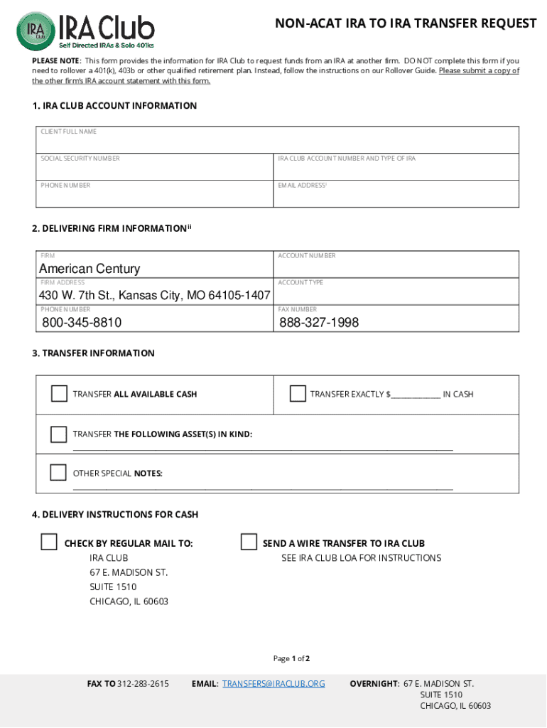 NONACAT IRA TO IRA TRANSFER REQUEST PLEASE NOTE: This form provides the information for IRA Club to request funds from an IRA at another firm. DO NOT complete this form if you need to roll over a