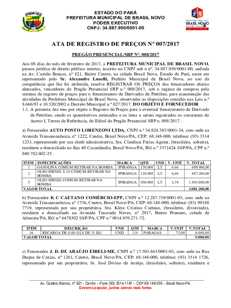 ESTATE DO PAR PREFECTURE MUNICIPAL DE BRAZIL NOVA POWER EXECUTIVE CNJ: 34.887.950/000100ATA DE REGISTRY DE PRESS N 007/2017 PRESO PRESENCE/SRP N. 008/2017 AOS 08 Dias do ms de several DE 2017, a PREFECTURE