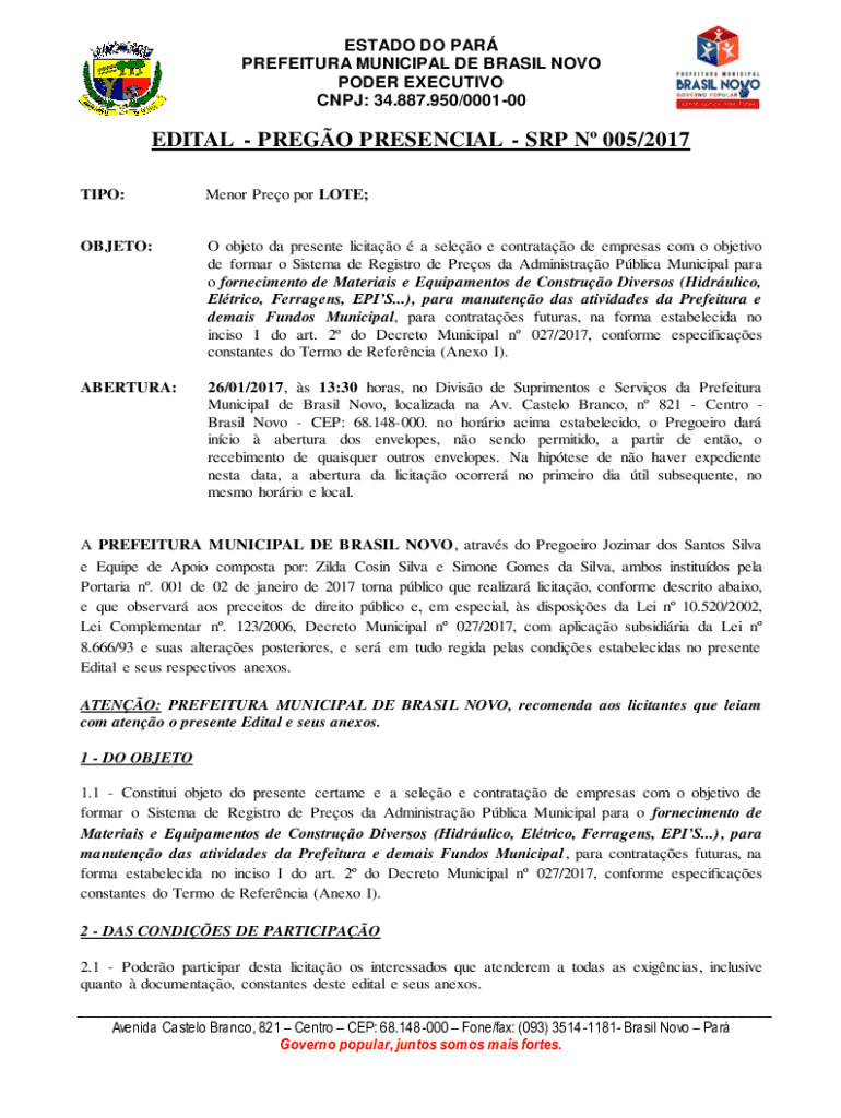 CNJ: 34.887.950/000100EDITAL PRESO PRESENCE SRP N 005/2017
