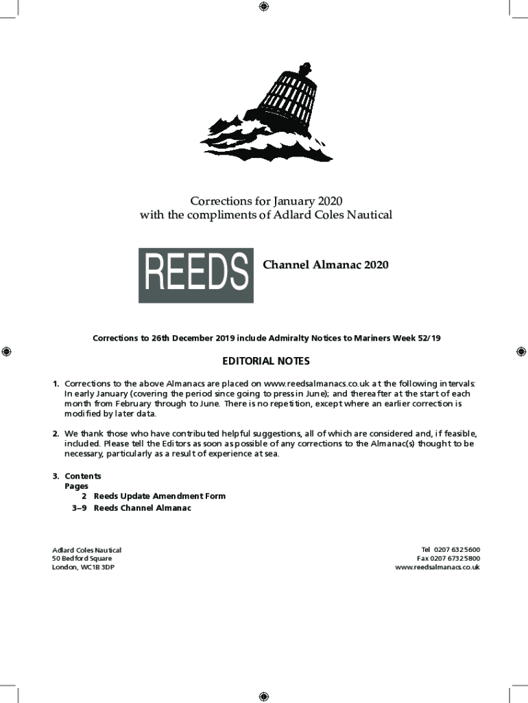 Corrections for January 2020 with the compliments of Ad lard Cole's NauticalREEDSChannel Almanac 2020Corrections to 26th December 2019 include Admiralty Notices to Mariners Week 52/19EDITORIAL NOTES