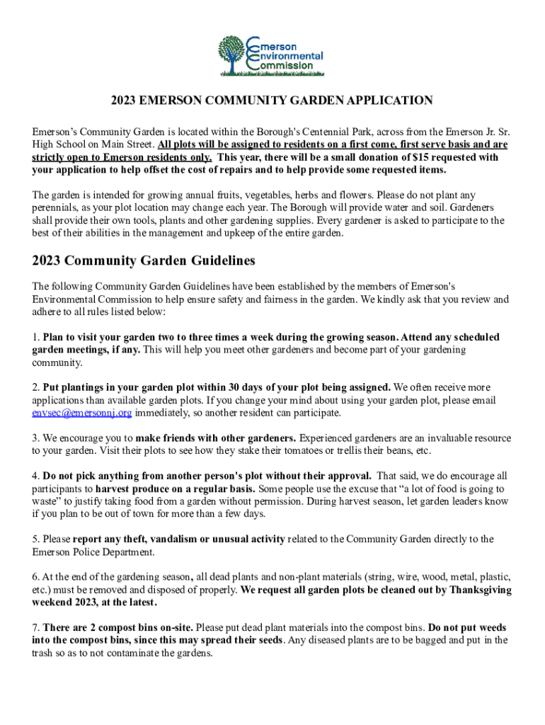 2023 EMERSON COMMUNITY GARDEN APPLICATION Emerson's Community Garden is located within the Borough\'s Centennial Park, across from the Emerson Jr. Sr. High School on Main Street. All plots will be