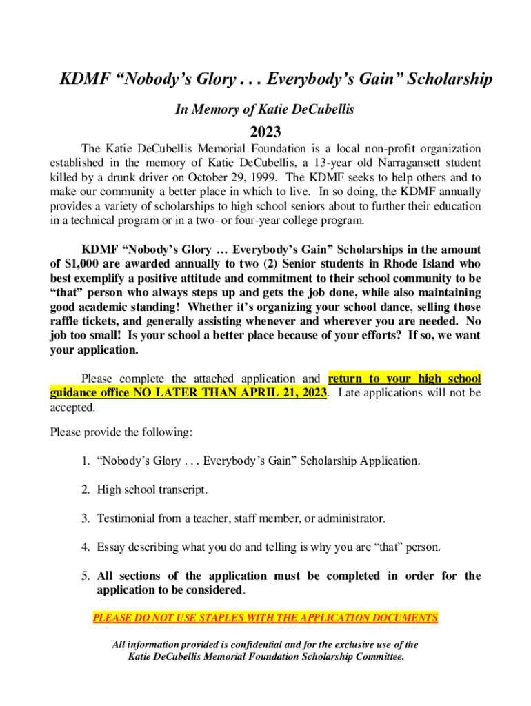 Get the free KDMF Nobody's Glory . . . Everybody's Gain Scholarship