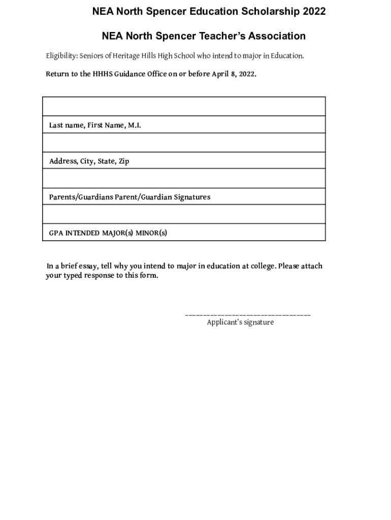 NEA North Spencer Education Scholarship 2022 NEA North Spencer Teachers Association Eligibility: Seniors of Heritage Hills High School who intend to major in Education. Return to the HHS Guidance