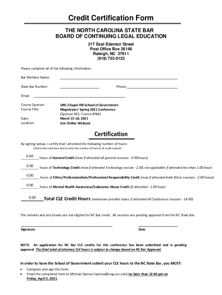 Credit Certification Form THE NORTH CAROLINA STATE BAR BOARD OF CONTINUING LEGAL EDUCATION 217 East Denton Street Post Office Box 26148 Raleigh, NC 27611 (919) 7330123 Please complete all the following