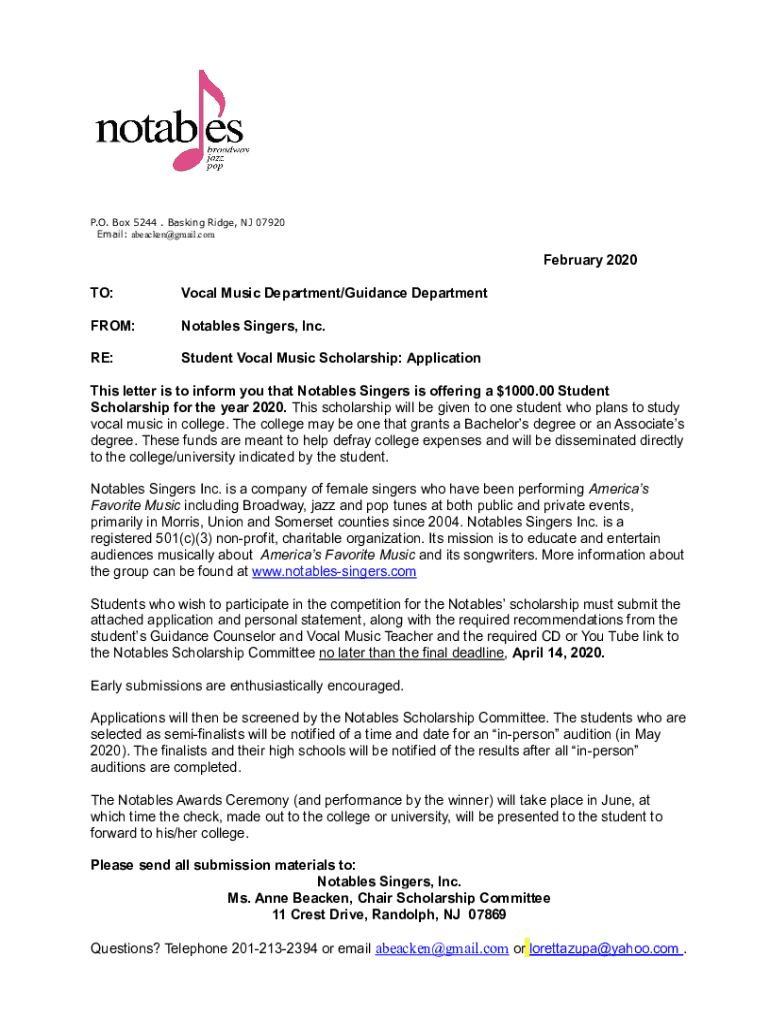 P.O. Box 5244. Basking Ridge, NJ 07920 Email: abeacken@gmail.comTO:Vocal Music Department/Guidance DepartmentFROM:Notables Singers, Inc.RE:February 2020Student Vocal Music Scholarship: Applications