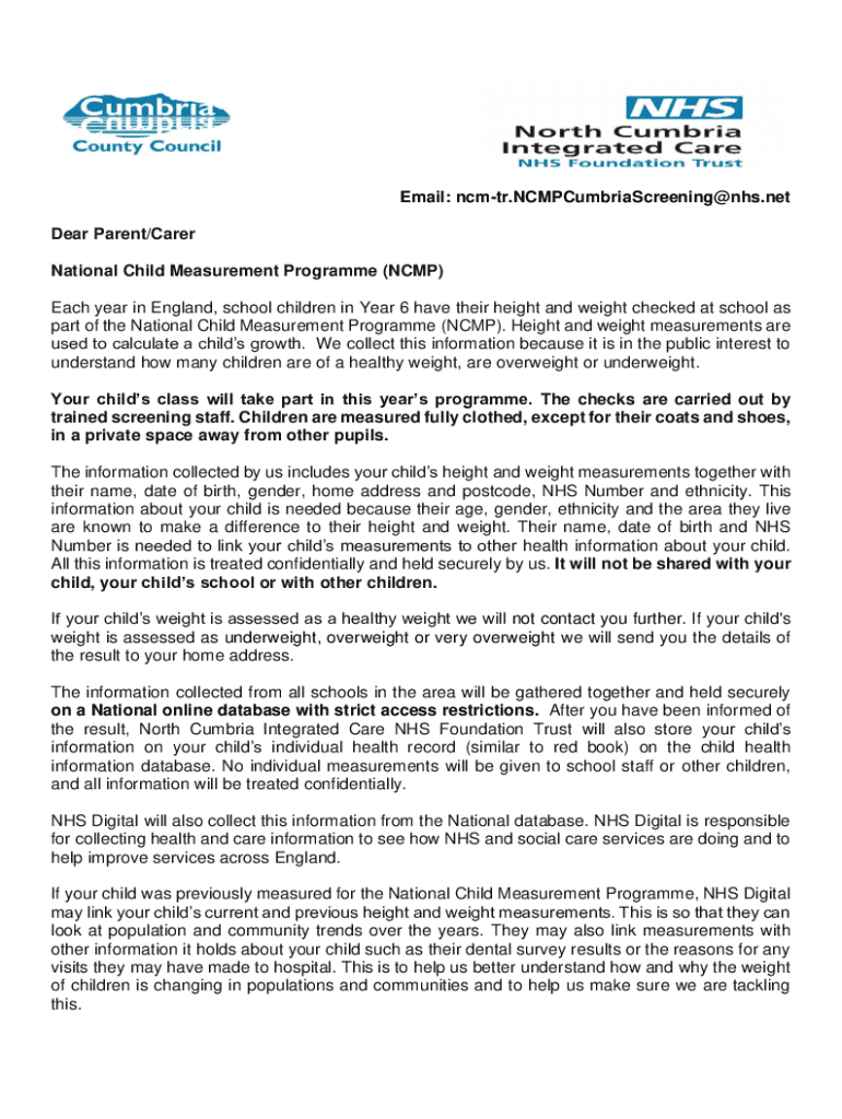 Email: ncmtr.NCMPCumbriaScreening@nhs.net Dear Parent/Carer National Child Measurement Program (RCMP) Each year in England, school children in Year 6 have their height and weight checked at school