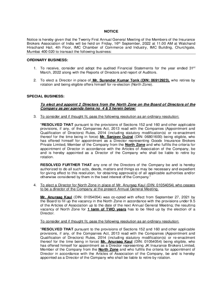 NOTICE is hereby given that the Twenty First Annual General Meeting of the Members of the Insurance Brokers Association of India will be held on Friday, 16th September, 2022 at 11.00 AM at Watchband