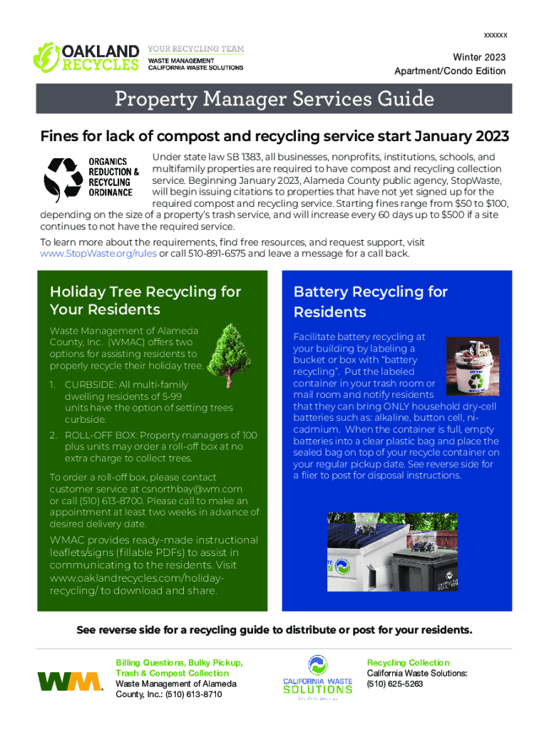 XXXXXXWinter 2023 Apartment/Condo EditionProperty Manager Services Guide Fines for lack of compost and recycling service start January 2023 Under state law SB 1383, all businesses, nonprofits, institutions,