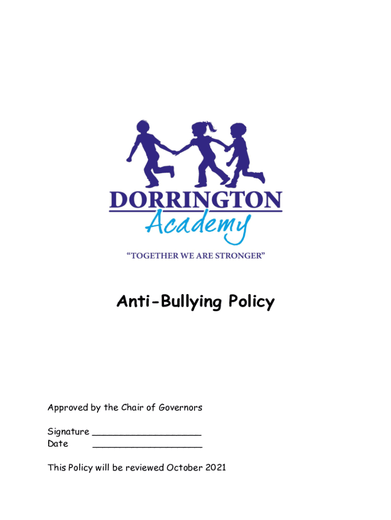 AntiBullying PolicyApproved by the Chair of Governors Signature ___ Date ___ This Policy will be reviewed October 2021AntiBullying Policy All members of the Torrington Academy Community are committed