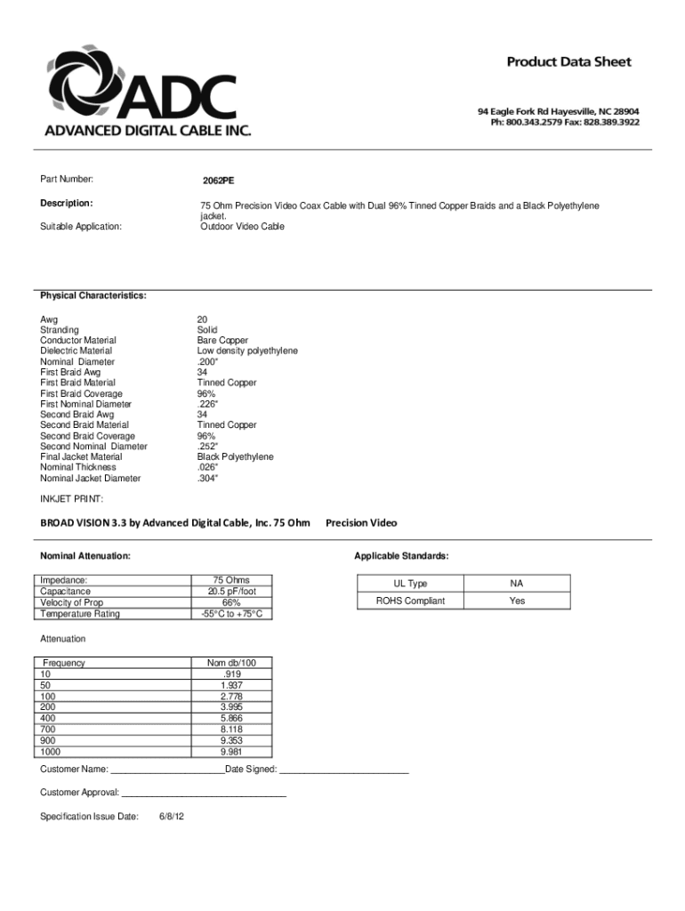 Part Number:2062PEDescription:75 Ohm Precision Video Coax Cable with Dual 96% Tinned Copper Braids and a Black Polyethylene jacket. Outdoor Video CableSuitable Application:Physical Characteristics: