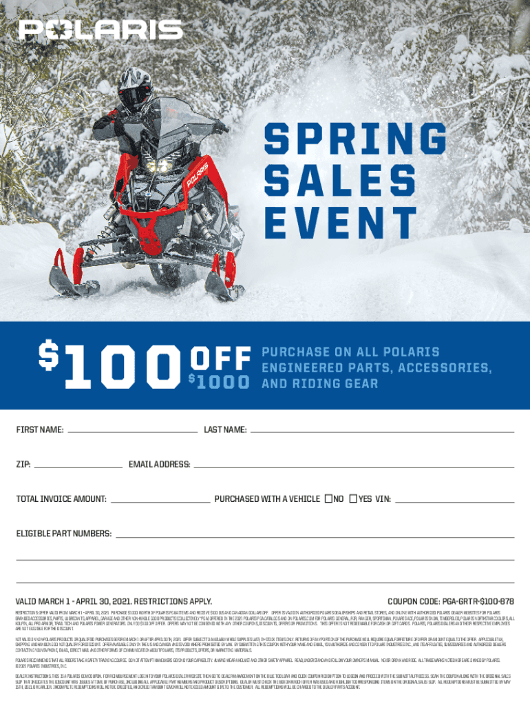 SPRING SALES EVENT $100FIRST NAME:OFF$1000P U R C H ASE O N A L L P O L A R I S E N G I N E E R E D PA R TS, AC C E SS O R I E S, AND RIDING EARLIEST NAME:ZIP:EMAIL ADDRESS:TOTAL INVOICE AMOUNT:PURCHASED