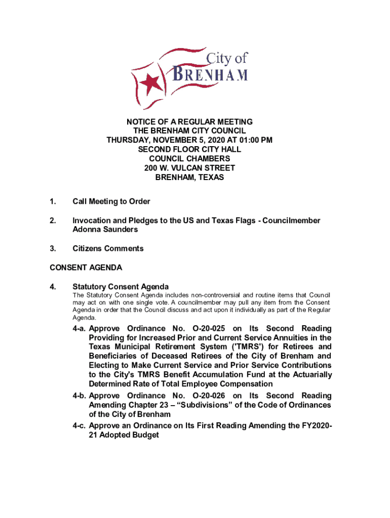 NOTICE OF A REGULAR MEETING THE BRENDAN CITY COUNCIL THURSDAY, NOVEMBER 5, 2020, AT 01:00 PM SECOND FLOOR CITY HALL COUNCIL CHAMBERS 200 W. VULCAN STREET BRENDAN, TEXAS 1. Call Meeting to Order2.