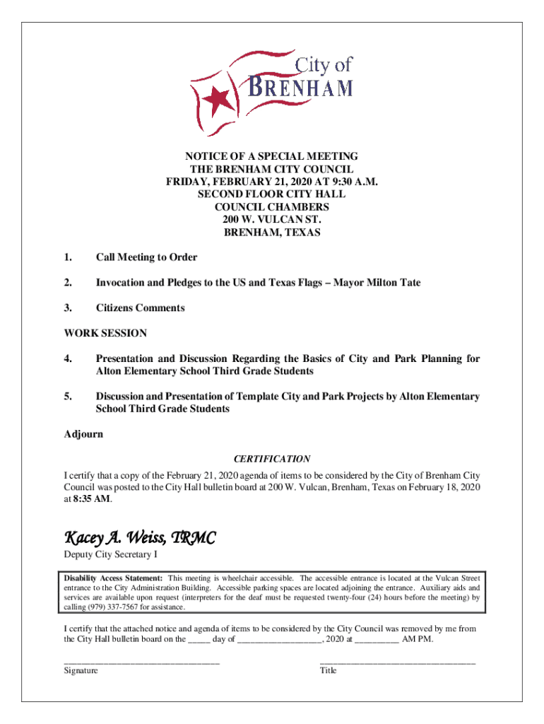 NOTICE OF A SPECIAL MEETING THE BRENDAN CITY COUNCIL FRIDAY, FEBRUARY 21, 2020, AT 9:30 A.M. SECOND FLOOR CITY HALL COUNCIL CHAMBERS 200 W. VULCAN ST. BRENDAN, TEXAS 1. Call Meeting to Order2. Invocation