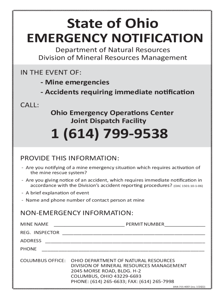 State of OhioEMERGENCY NOTIFICATION Department of Natural Resources Division of Mineral Resources Management IN THE EVENT OF: Mine emergencies Accidents requiring immediate notification CALL:Ohio
