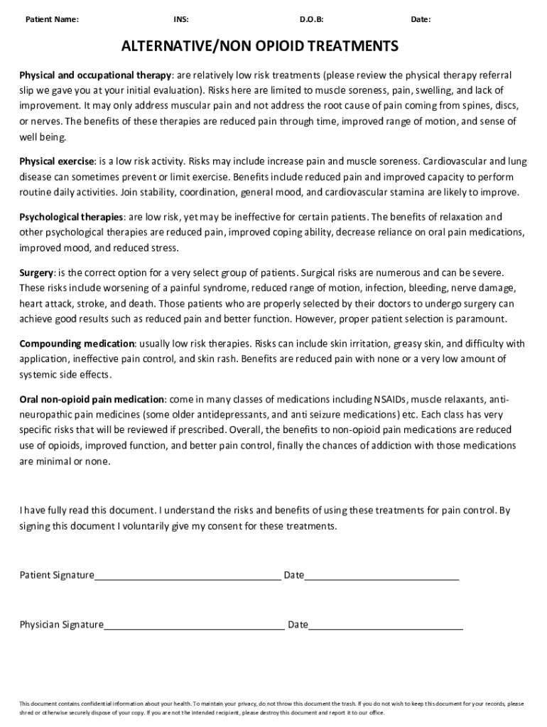 Patient Name:INS:D.O.B:Date:ALTERNATIVE/NON-OPIOID TREATMENTS Physical and occupational therapy: are relatively low risk treatments (please review the physical therapy referral slip we gave you at
