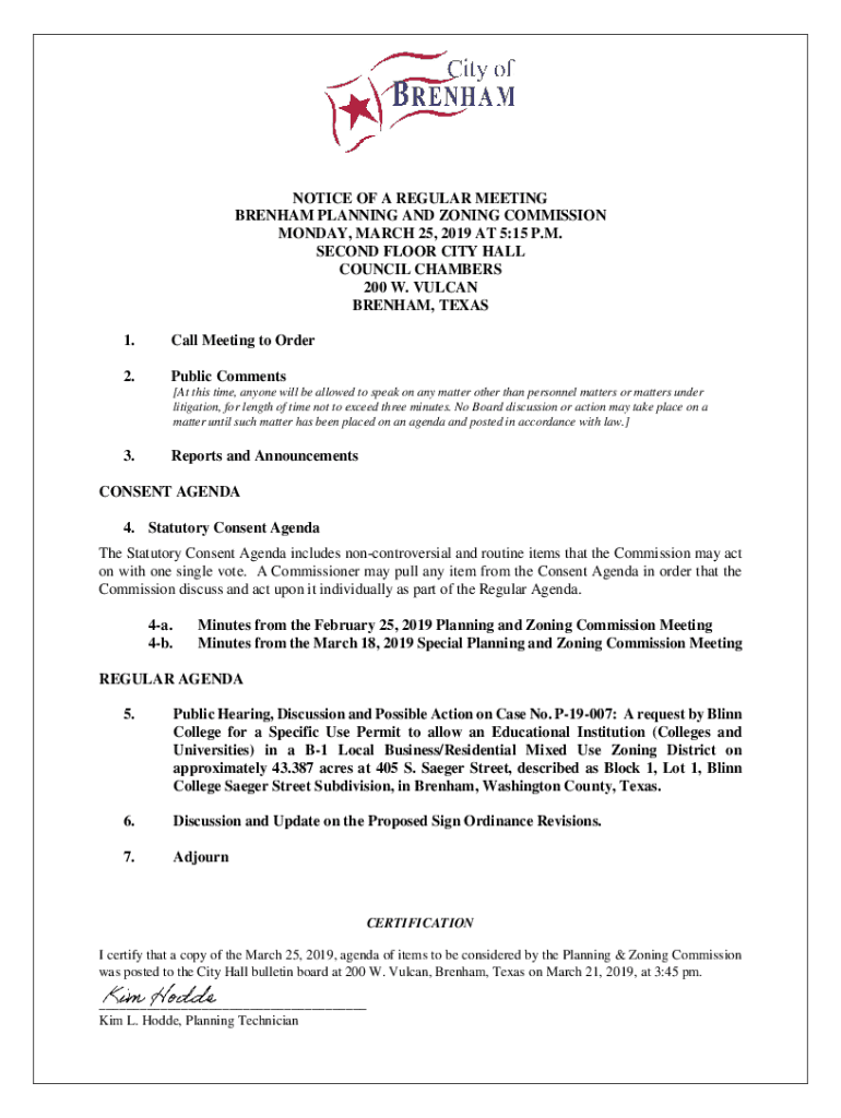 NOTICE OF A REGULAR MEETING BRENDAN PLANNING AND ZONING COMMISSION MONDAY, MARCH 25, 2019, AT 5:15 P.M. SECOND FLOOR CITY HALL COUNCIL CHAMBERS 200 W. VULCAN BRENDAN, TEXAS 1. Call Meeting to Order2.
