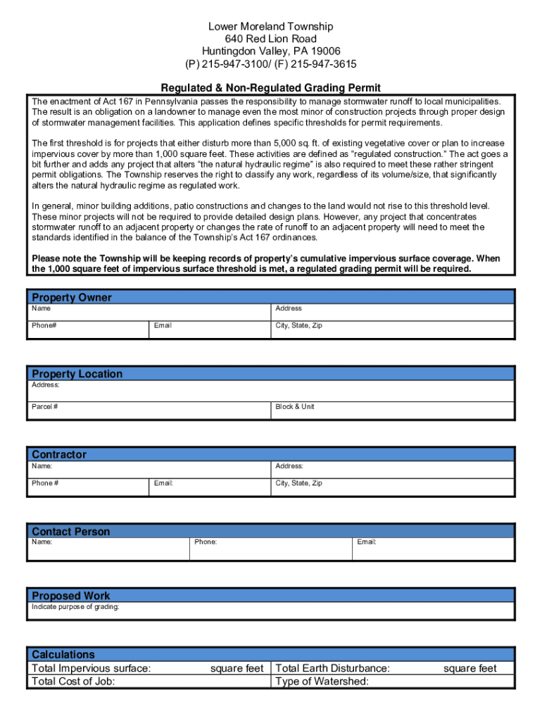 Lower Moreland Township 640 Red Lion Road Huntington Valley, PA 19006 (P) 2159473100/ (F) 2159473615 Regulated & Unregulated Grading Permit The enactment of Act 167 in Pennsylvania passes the responsibility