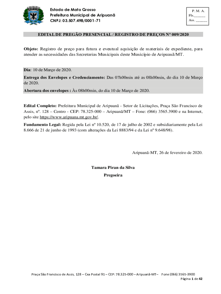 Est ado de Mato Grosso Prefecture Municipal de Aripuan CNJ: 03.507.498/000171P. M. A. FLS.___ Ass. ___EDIT AL DE PRESO PRESENCE / REGISTRY DE PRESS N 009/2020 Object: Registry DE pro para future e