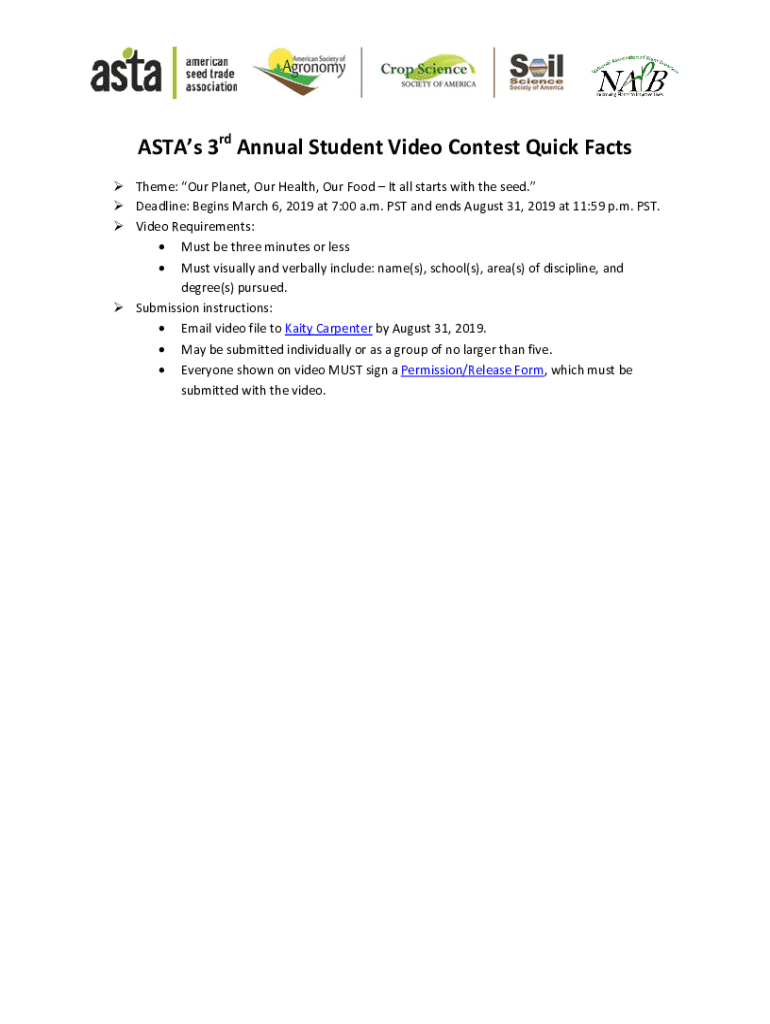 Pastas 3rd Annual Student Video Contest Quick Facts Theme: Our Planet, Our Health, Our Food It all starts with the seed. Deadline: Begins March 6, 2019, at 7:00 a.m. PST and ends August 31, 2019,