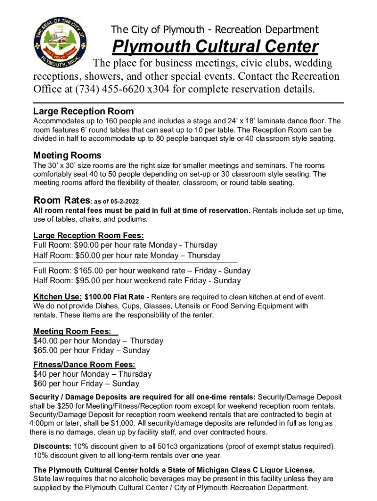 The City of Plymouth Recreation Department Plymouth Cultural Center The place for business meetings, civic clubs, wedding receptions, showers, and other special events. Contact the Recreation Office