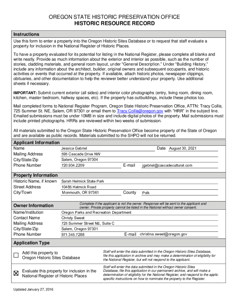 OREGON STATE HISTORIC PRESERVATION OFFICE HISTORIC RESOURCE RECORD Instructions Use this form to enter a property into the Oregon Historic Sites Database or to request that staff evaluates a property
