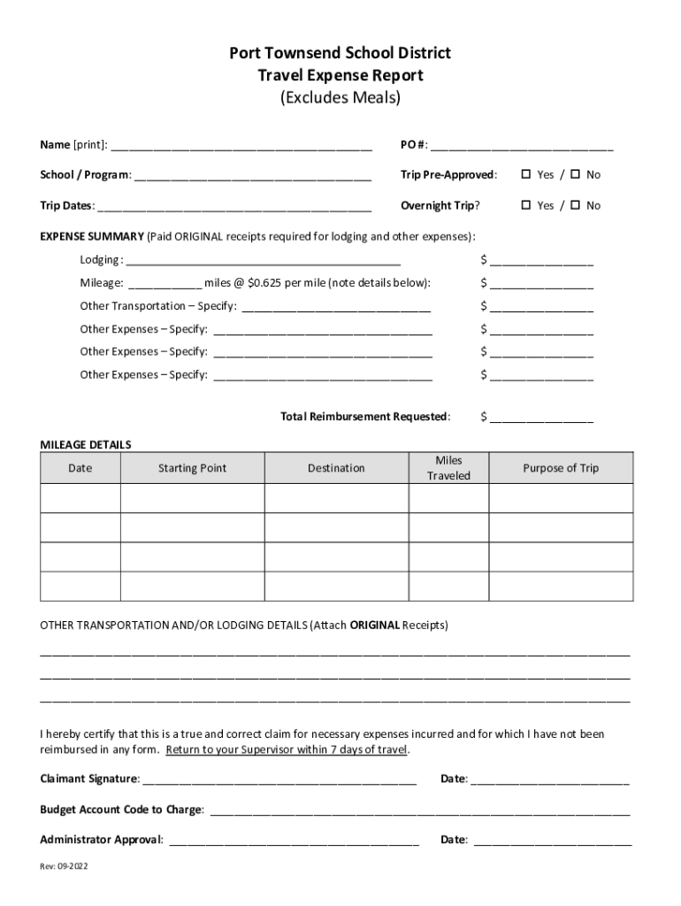 Port Townsend School District Travel Expense Report (Excludes Meals) Name [print]: ___PO #: ___School / Program: ___Trip PreApproved: Yes / No Trip Dates: ___Overnight Trip? Yes / Expense SUMMARY