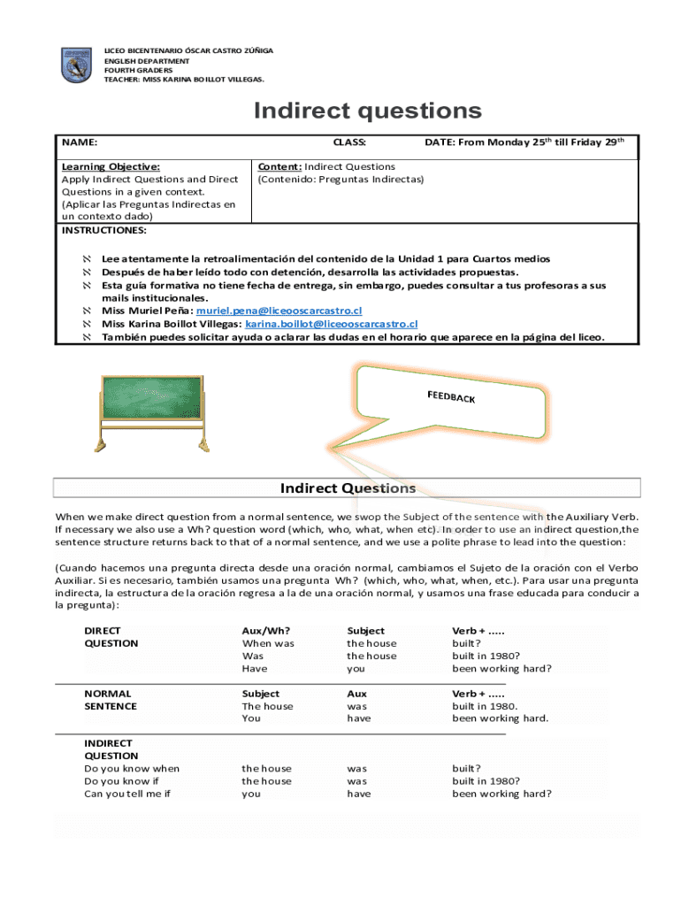 LICE BICENTENARY SCAR CASTRO RIGA ENGLISH DEPARTMENT FOURTH GRADERS TEACHER: MISS KARINA BALLOT VILLEGAS. Indirect questions NAME: Learning Objective: Apply Indirect Questions and Direct Questions