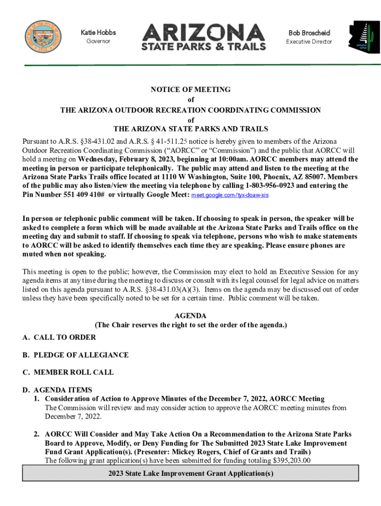 Katie Hobbs Governor Bob Broached Executive DirectorNOTICE OF MEETING of THE ARIZONA OUTDOOR RECREATION COORDINATING COMMISSION of THE ARIZONA STATE PARKS AND TRAILS Pursuant to A.R.S. 38431.02 and