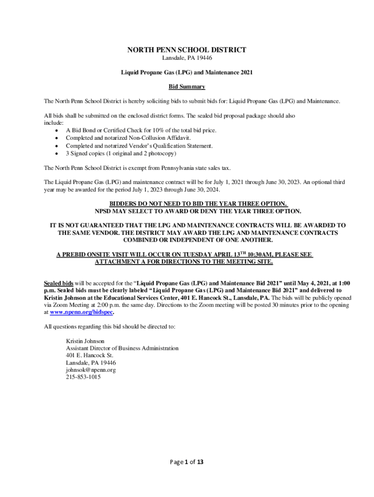 NORTH PENN SCHOOL DISTRICT Lawndale, PA 19446 Liquid Propane Gas (LPG) and Maintenance 2021 Bid Summary The North Penn School District is hereby soliciting bids to submit bids for: Liquid Propane