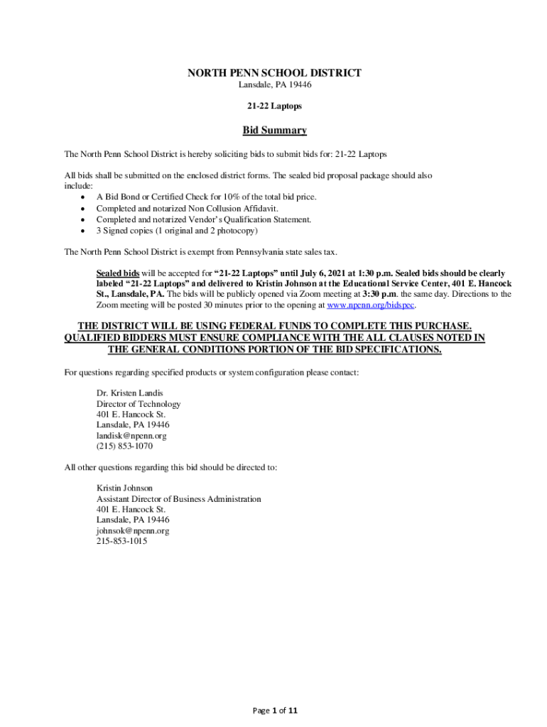 NORTH PENN SCHOOL DISTRICT Lawndale, PA 19446 2122 Laptops Summary The North Penn School District is hereby soliciting bids to submit bids for: 2122 Laptops All bids shall be submitted on the enclosed