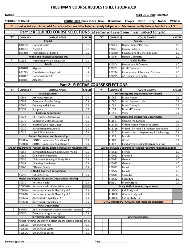 FRESHMAN COURSE REQUEST SHEET 20182019