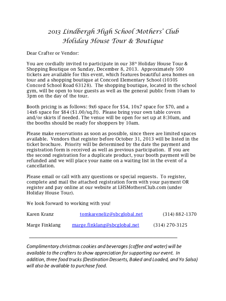 2013 Lindbergh High School Mothers Club Holiday House Tour & Boutique Dear Crater or Vendor: You are cordially invited to participate in our 38th Holiday House Tour & Shopping Boutique on Sunday,