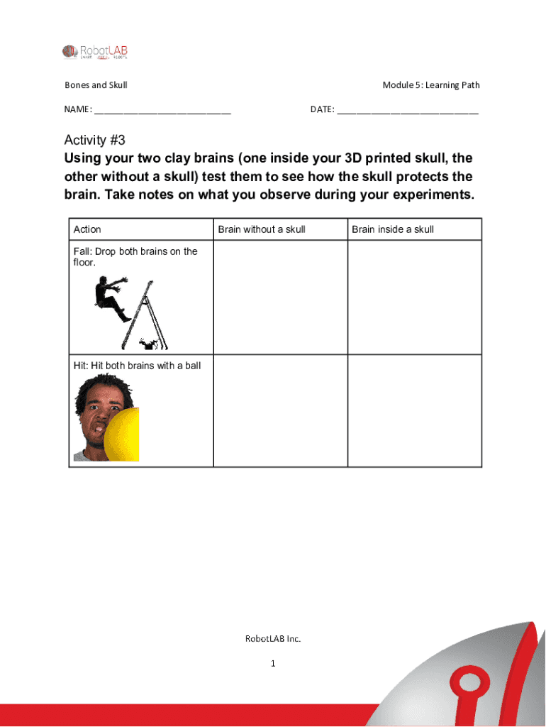 Bones and Sub-module 5: Learning Pathway: ___DATE: ___Activity #3 Using your two clay brains (one inside your 3D printed skull, the other without a skull) test them to see how the skull protects the
