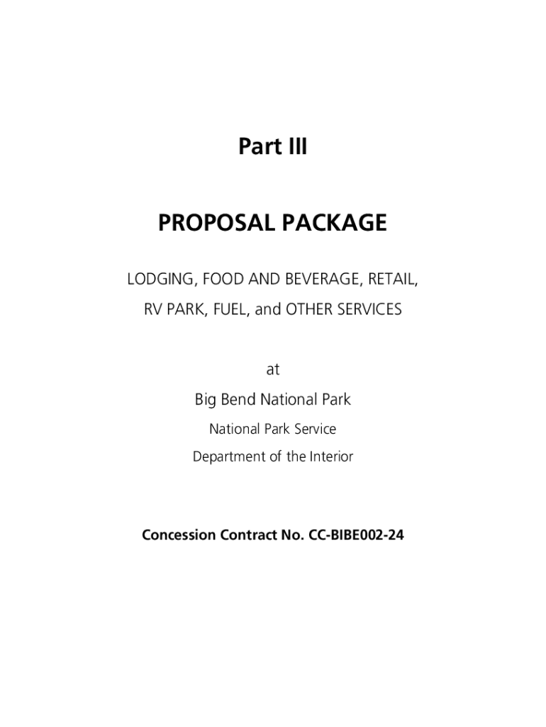 Part III PROPOSAL PACKAGE LODGING, FOOD AND BEVERAGE, RETAIL, RV PARK, FUEL, and OTHER SERVICES at Big Bend National Park Service Department of the InteriorConcession Contract No. CCBIBE00224CCBIBE00224Proposal