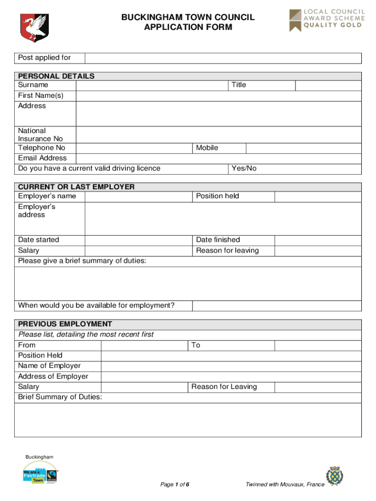 BUCKINGHAM TOWN COUNCIL APPLICATION FORM Post applied for PERSONAL DETAILS Surname First Name(s) AddressTitleNational Insurance No Telephone No Email Address Do you have a current valid driving license