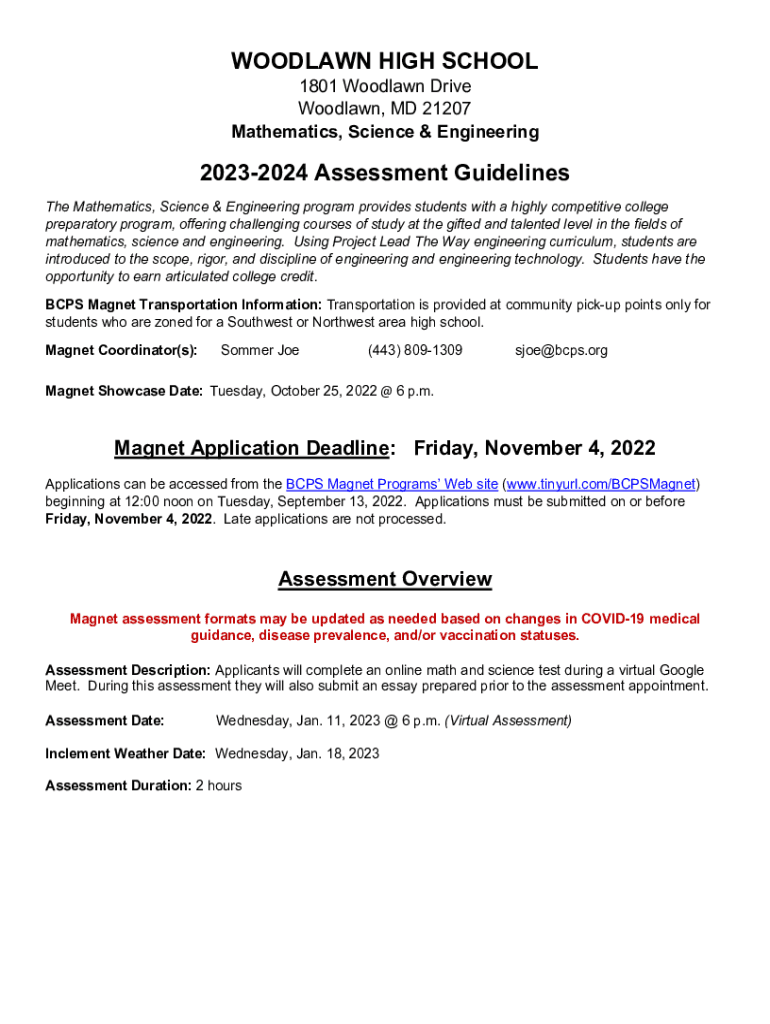 WOODLAWN HIGH SCHOOL1801 Woodlawn Drive Woodlawn, MD 21207 Mathematics, Science & Engineering20232024 Assessment Guidelines The Mathematics, Science & Engineering program provides students with a